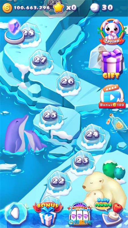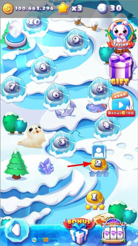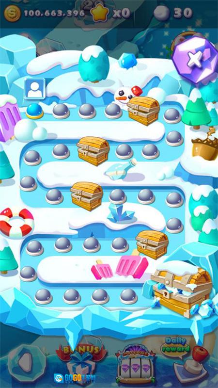 1. 当玩家开启冰雪消消乐icecrush这款游戏,进入到游戏的主页面后,能够进行签到从而领取奖励,还可以点击关卡来开启闯关之旅。