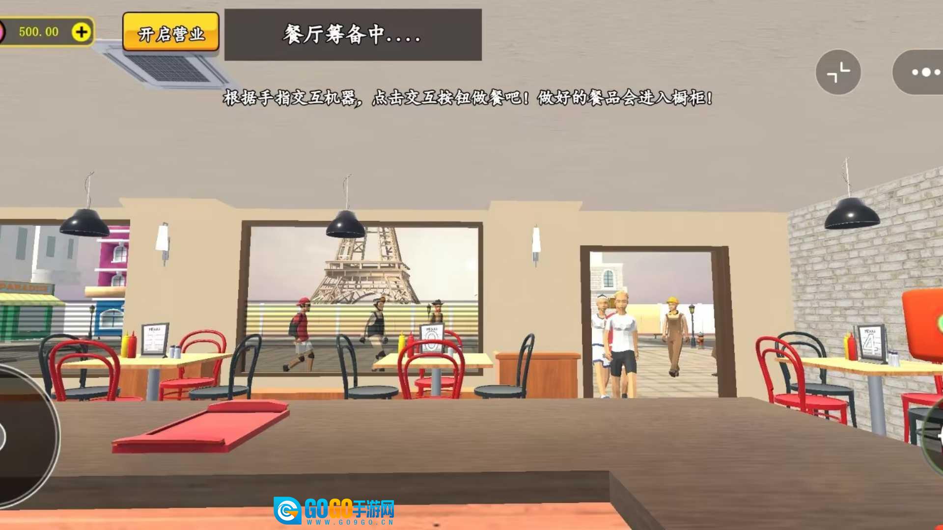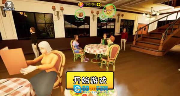 1当你进入游戏,映入眼帘的是餐厅中,一桌桌客人正享用美食,此时点击“开始游戏”即可。