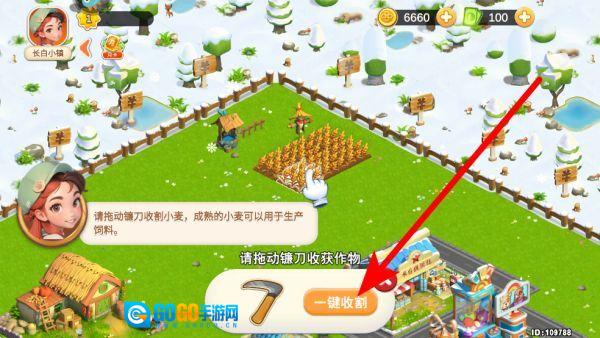 2、在进行收割操作时,既可以通过拖动镰刀的方式手动收割,也能够直接点击一键收割按钮,快速收取已成熟的作物。而收获的这些作物,可应用于生产等方面。