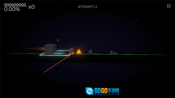 2. 当遭遇三角形障碍物的时候,操控方块进行跳跃以躲避,防止发生碰撞。