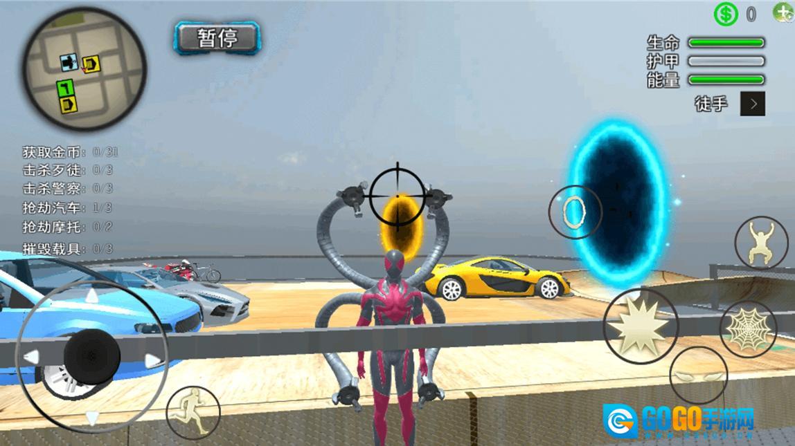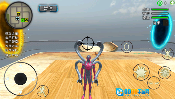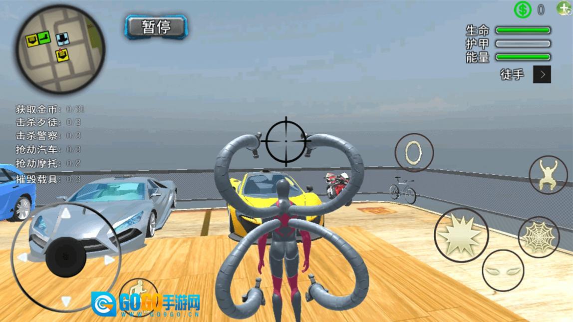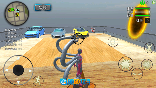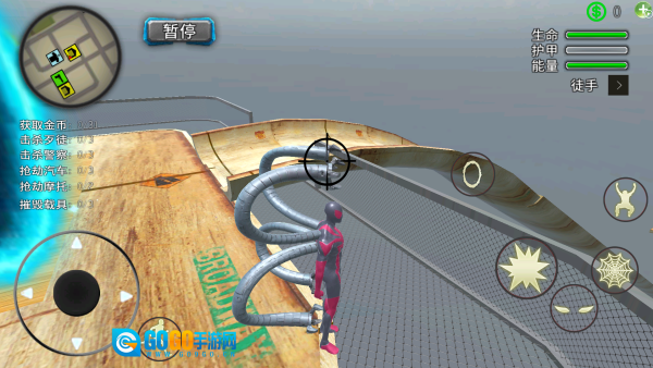1. 通过虚拟摇杆来控制角色移动,轻点操作发射蛛丝,借此钩住建筑,进而达成高空摆荡的效果。