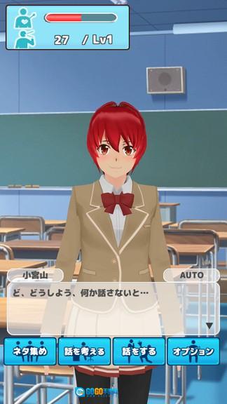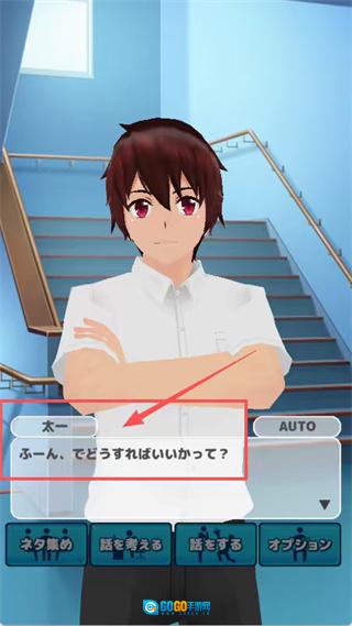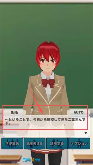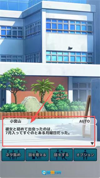1. 当你进入游戏,映入眼帘的是动漫风格的对话框,通过点击四个功能键来选择相应操作。在右上角有个“AUTO”按钮,此按钮能设置为自动播放,游戏背景呈现的是现代建筑与绿植。