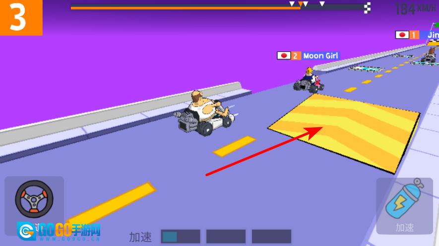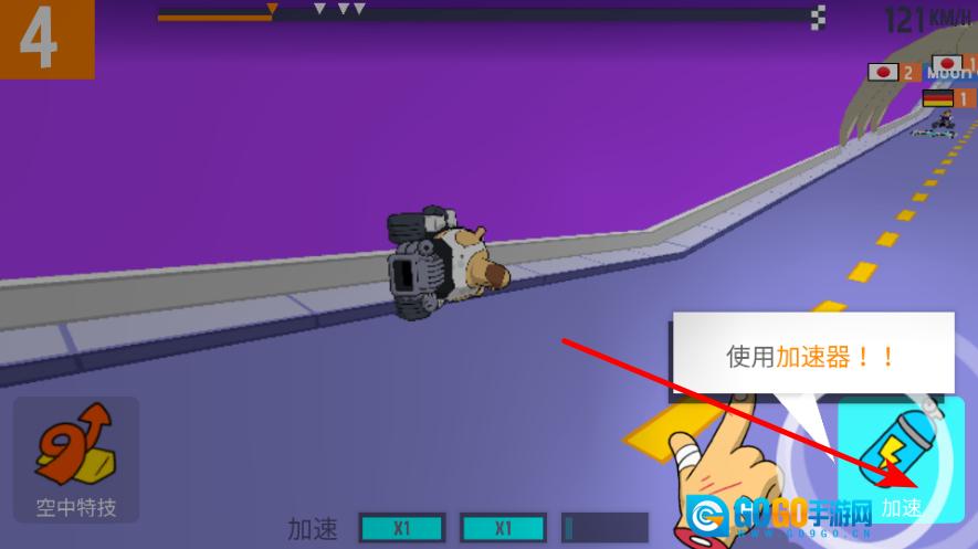 3、若想提升赛车速度,在关键路段与对手拉开差距,可通过点击加速按钮,使用加速道具或加速器。