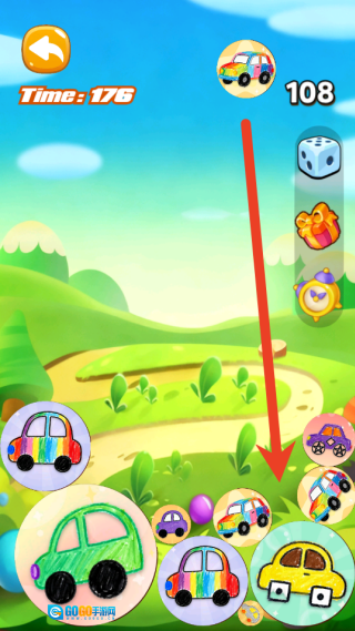 1、采用手指拖拽的方式,把场地上两辆相同的小汽车挪动到一处,进而实现合成升级。