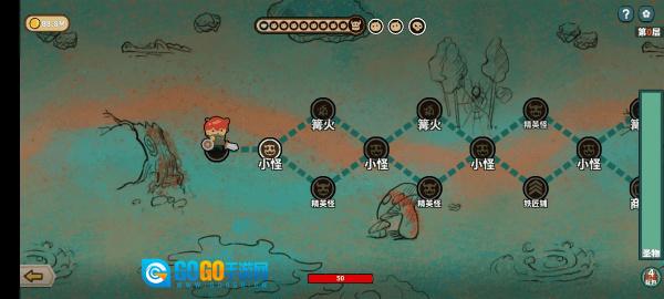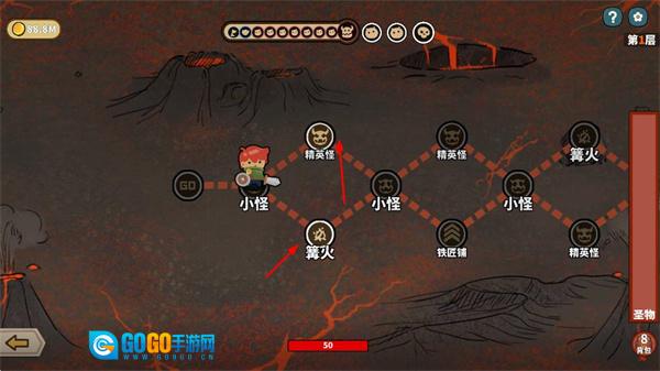4、于dungeon地图里挑选路径,迎战小怪、精英怪,探寻篝火、铁匠铺等功能地点。