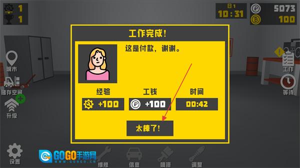 4、修理工作完成后,屏幕将弹出“工作完成!”的提示。此时,你可以查看本次工作所获得的经验值与工钱。若确认无误,点击“太棒了!”即可接收报酬,并开启下一个工作任务。