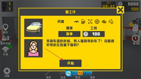 1. 于游戏界面瞧见新工作提示,得知任务为修理左后翼子板,难度为简单,工钱100,点击“开始”。