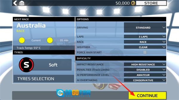 2、能够选择游戏起始的轮胎类型、天气、圈数等,之后点击“CONITNUE”