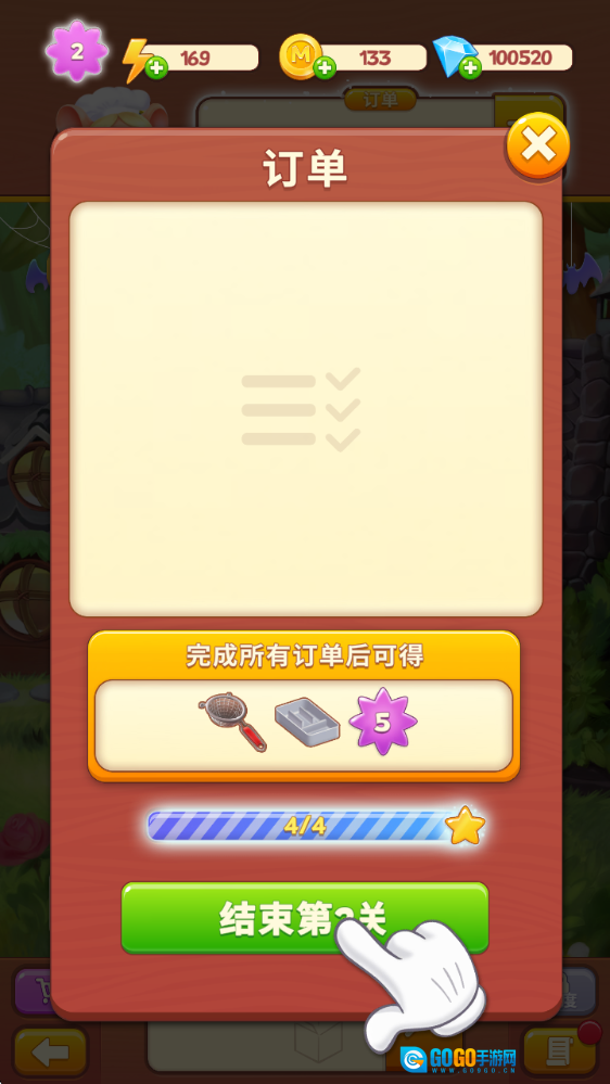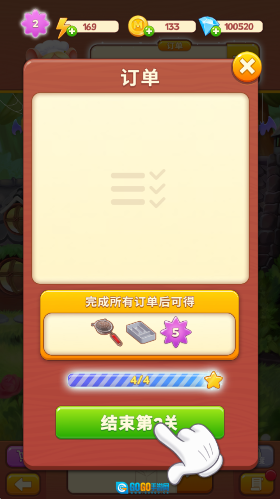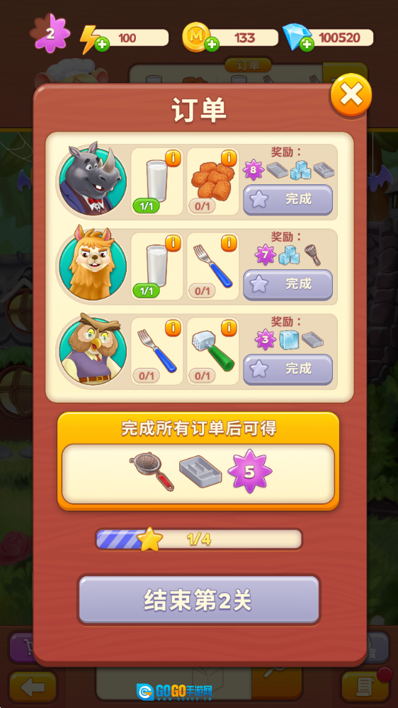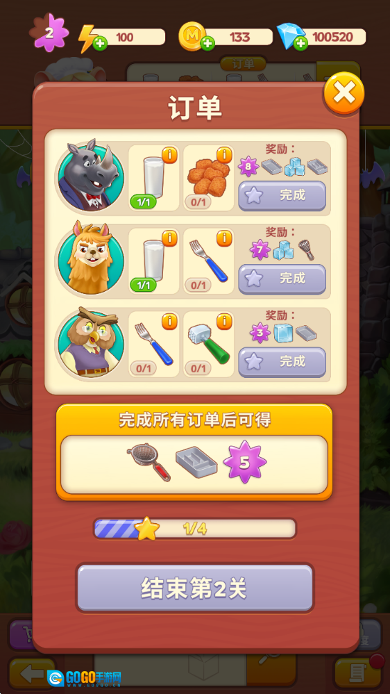 7、当所有订单都完成后,就能顺利过关并获取奖励。