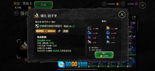 铁匠的等级,决定了你所能锻造装备等级的上限。提升铁匠等级需要消耗材料,等级越高,所需材料数量越多,对材料品质的要求也越高。紫色装备与橙色装备皆可强化10次,在强化到第1次、第4次、第7次以及第10次时,会额外获得新的属性。