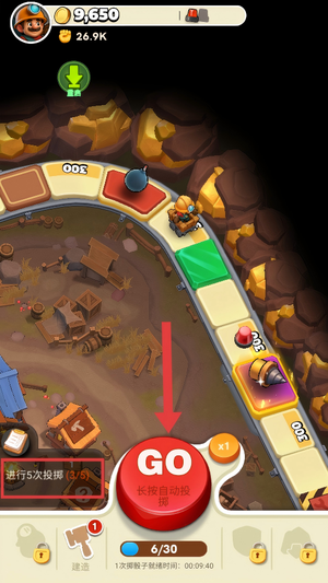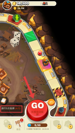 1. 打开游戏界面,查看“进行5次投掷35”这一任务的进度,接着点击“GO”按钮,开始通过投掷骰子来移动角色位置。