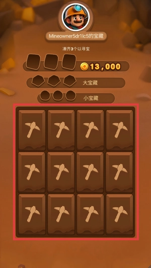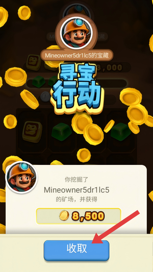 3、当成功挖掘到宝藏后,寻宝行动界面会随即出现,此时点击收取按钮,就能获取金币奖励,资源也会自动存入您的账户之中。