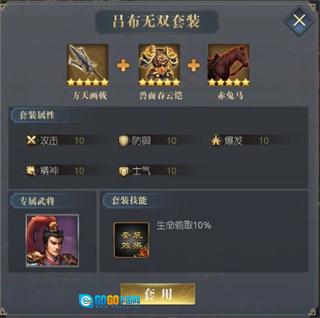 吕布的无双套装包含:方天画戟、兽面吞云铠以及赤兔马。
