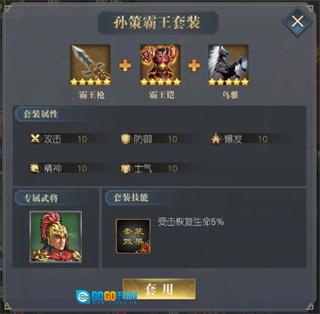 孙策的霸王套装包含:霸王枪、霸王铠以及乌骓。
