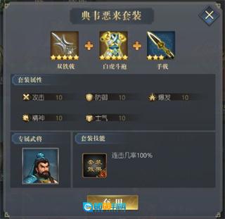典韦恶来套装包含:双铁戟、白虎斗袍以及手戟。