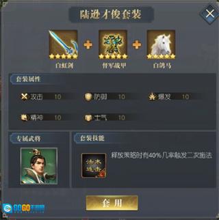 陆逊才俊套装包含:白虹剑、督军战甲以及白鸽马。