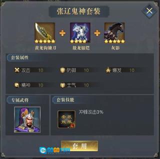 张辽的鬼神套装包含:黄龙钩镰刀、敖龙银铠以及灰影。