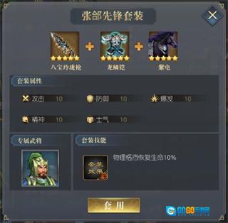 张郃先锋装备套装包含:八宝玲珑枪、龙鳞铠以及紫电。