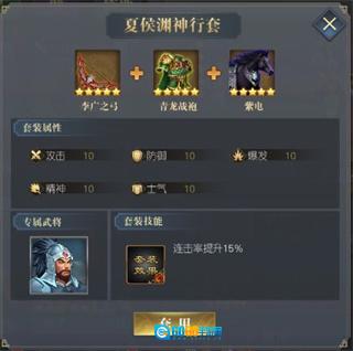 夏侯渊神行套装包含:李广之弓、青龙战袍以及紫电。