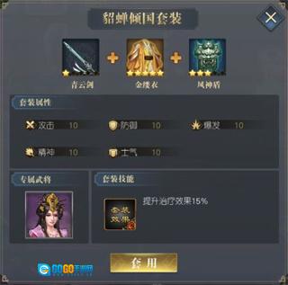 貂蝉倾国套装包含:青云剑、金缕衣以及风神盾。