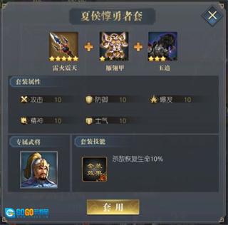 夏侯惇的勇者套装包含:雷火震天、雁翎甲以及玉追。