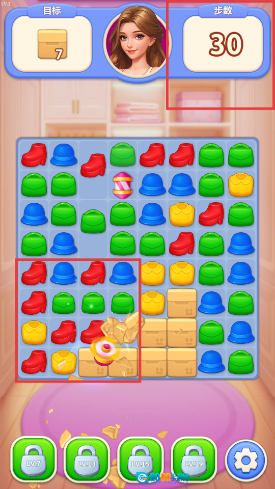 3、当目标还剩余7个【箱子】,且步数为30步时,应优先消除红色方框区域的元素,以此触发连锁消除,从而加速箱子的收集。