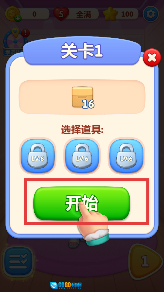 1在关卡1中,点击绿色的【开始】按钮即可进入游戏。此时虽然有道具可供选择,但在前期这些道具尚未解锁,进入游戏后会直接开启消除任务。