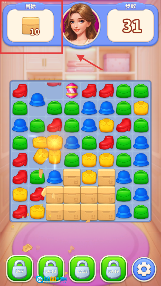 2、游戏目标是收集16个【箱子】,共有31步。需消除箱子周边元素,使箱子解锁或下落,从而推进收集进程。
