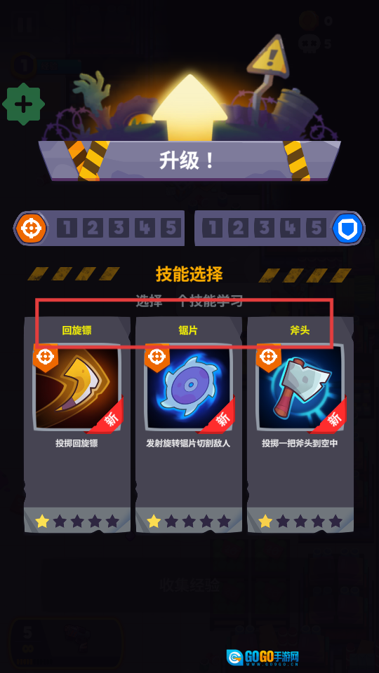 4、升级过程中可挑选技能,像回旋镖、锯片、斧头之类,以此提高战斗效率,从而应对更为强大的敌人。