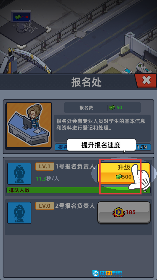 4、轻点【升级】按钮,即可提升报名处负责人的等级,从而加快报名速度,有力推动游戏发展进程。