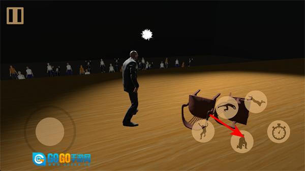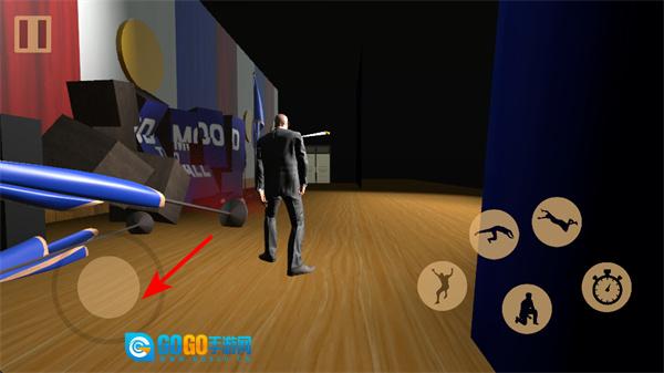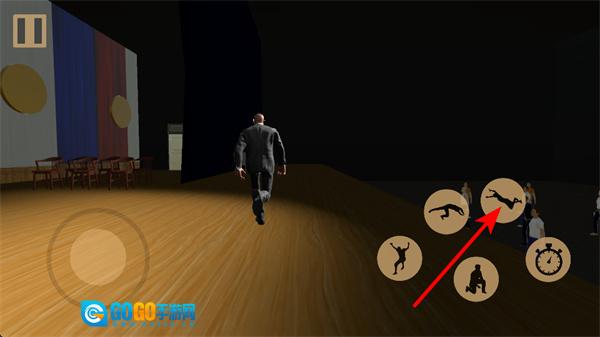 3、点击右侧的下蹲按钮,便能使角色下蹲,借助场景里的掩体来躲避敌人或者隐藏自己。