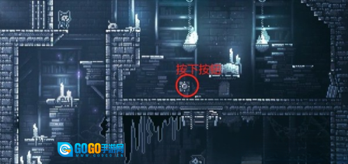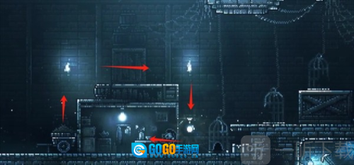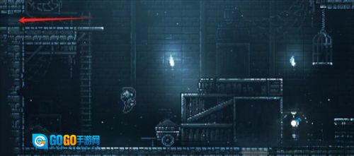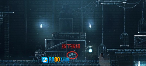 7. 从流浪者视角来看,按下黑色怪物左边的按钮,此时3个铁笼会升起来,接着爬上铁笼后朝右行走,随后攀爬最右边的梯子向上。