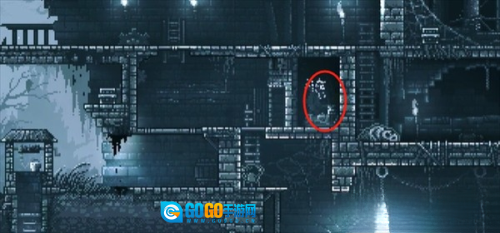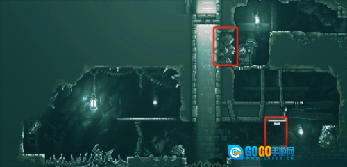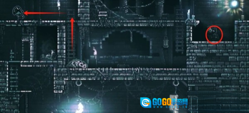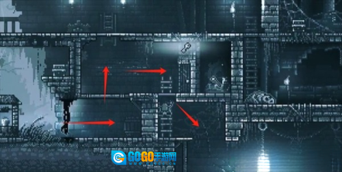 15. 一旦遭遇怪物,立刻返回下图所示之处。待怪物跳过右侧后,赶紧攀爬左边的梯子,接着向左奔跑。跑到左边尽头后,再向上攀爬。爬到最高层后,往右跑,直至怪物掉进尖刺坑中。