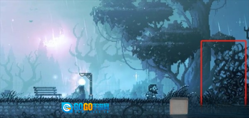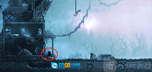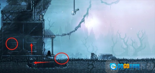 3. 转换到流浪者的视角。朝左行进至房子前那块松动的木板处,站在木板上连续跳跃数次,使木板遭到破坏,接着从木板下方的坑道爬进房子,拿到镰刀。随后推开房门走出去,用某种方式砸死门外的黑色怪物。