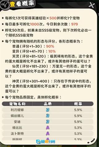 4、在孵化机(抽卡)中,仅能抽到普通与变异这两种形态的宠物。前期可适量抽取变异SSS宠物,其资质为最高。到了后期,仅使用获取的免费抽卡券进行抽取就可以了。