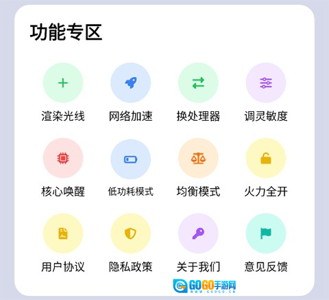 包含渲染光线、网络加速、更换处理器、调节灵敏度、核心唤醒、低功耗模式、均衡模式、火力全开等共计十二项硬核功能