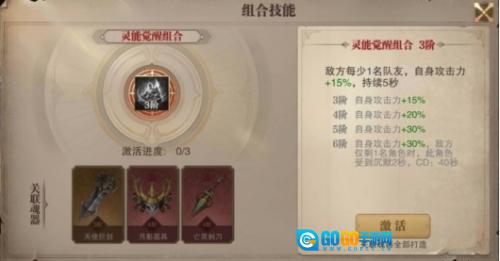 灵能觉醒的激活等级为3阶,激活所需的三种魂器分别是:【天使巨剑】(需60个碎片激活)、【月影面具】(需90个碎片激活)以及【亡灵刺刀】(需90个碎片激活)。激活后,敌方每减少1名队友,自身攻击力便会增加15%,该效果持续5秒。简单来说,在PVP场景中,对手每少一个角色,自身攻击力就会额外增加15% 。此外,该觉醒效果在不同阶数下,对自身攻击力的加成有所不同:3阶时自身攻击力加15%,4阶时加20%,5阶时加30%。