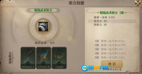 激活精锐武者组合,需集齐【暗杀者的太刀】、【诅咒巫师之盾】以及【人鱼面具】这三种魂器。每种魂器均需10张对应的碎片方可激活。激活精锐武者组合技能后,【致命一击几率】将得到提升,该技能最高可升至6阶。其中,1阶时致命一击几率增加0.5%,升至满6阶则增加1.75%。值得一提的是,致命一击的伤害值比卓越一击略高,在战斗中所发挥的作用不容小觑。增加1.75%的致命一击几率,能在一些紧急情形下,有效增强角色的反击能力。