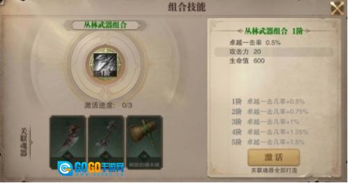 激活丛林武器组合,需集齐【猎犬小刀】、【牛怪双刃】以及【树妖的锤木槌】这三种魂器。每种魂器都要10张对应的碎片才能激活。激活丛林武器组合技能后,【卓越一击几率】将得到提升,最高可升至6阶。1阶时,卓越一击几率增加0.5%,到满级6阶,能增加1.75%。卓越伤害是当前游戏里三职业的主要输出途径,提高其触发几率还是相当不错的。而且,激活这个组合的门槛很低,众多新手玩家都能轻松达成。