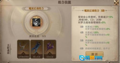 橙色技能魔兽后裔一经激活便是3阶,激活条件为:【金甲兽的弩箭】、【兽人大剑】、【女巫之杖】这三种魂器。鉴于其金色品质,每种魂器都需30张对应的碎片方可激活。激活魔兽后裔组合技能后,角色在遭受会心伤害时,所受伤害会减少15%,此效果持续三秒,同时对罗兰战场的首领增伤5% 。该技能最高可升至6阶,每提升一阶,受到伤害减少的比例以及对首领增伤的百分比都会有所增加。当达到满6阶时,在伤害减少的持续时间结束后,会对主目标造成1次技能系数为180%的会心伤害,并且对罗兰战场首领的增伤幅度达到20%。