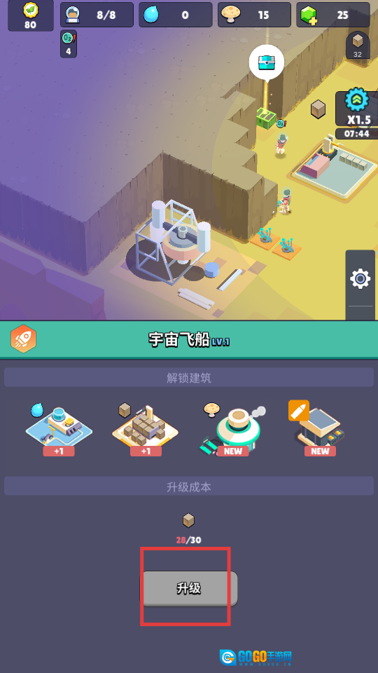 3、轻点【升级】按钮,提升宇宙飞船的等级,解锁全新建筑,强化游戏的发展能力。