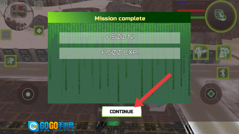 4、当任务完成后,点击【CONTINUE】按钮,即可领取奖励(例如 +1500N 与 +1500EXP ),进而开启下一个任务。