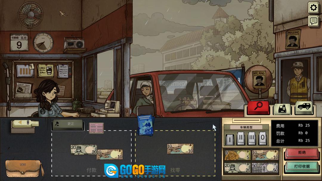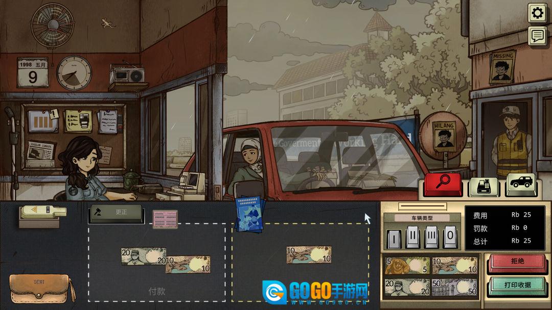 1《1998收费员的故事》是一款发人深省的叙事模拟游戏,其背景设定于虚构的东南亚国家贾纳帕。彼时,这个国家正遭受无情的内乱与金融崩溃的双重冲击。游戏的灵感来源于1998年亚洲金融危机以及印度尼西亚历史上的动荡阶段,它将玩家置身于一个充斥着不确定性与恐惧的环境里。在这般残酷的现实之下,玩家将扮演一名怀孕的收费员,从而体验生存、母性以及伦理道德所带来的深刻考验。为了即将出生的孩子,你得保住工作,以便能更好地做检查,同时阻止坏人通行。