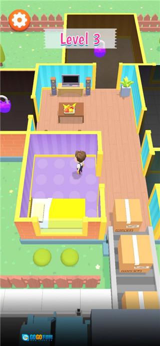 房间布置:玩家进入游戏后,能够通过左右操作来控制角色移动,走到门口打开箱子,获取家具和装饰物品,接着将这些物品合理放置在房间里。完成布置任务,就能解锁更多房间区域,像卧室、客厅、厨房、健身房、浴室等等。