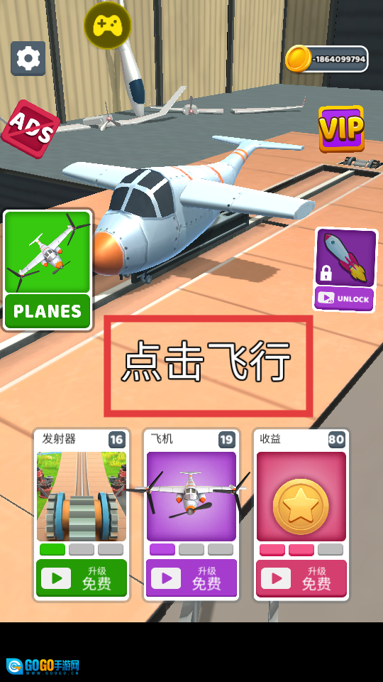 1. 在游戏界面中,点击【点击飞行】选项,通过对飞机、发射器以及收益系统进行自由升级,从而提升飞行性能。