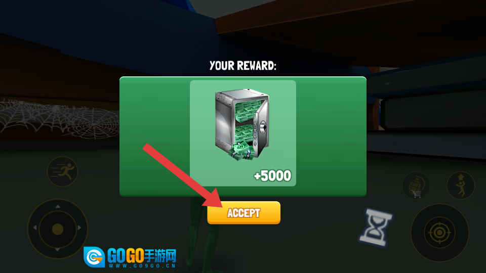 4、完成任务后,点击【ACCEPT】按钮来领取奖励(例如 +5000 金币),这些奖励可用于提升角色或解锁新内容。