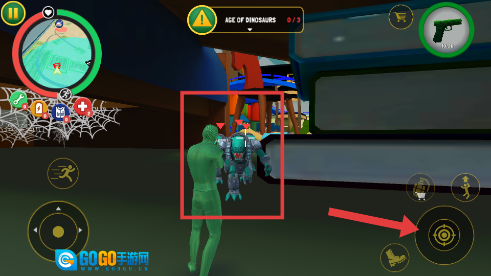 3、当遭遇恐龙敌人时,点击右侧的瞄准按钮展开攻击,以达成任务目标。