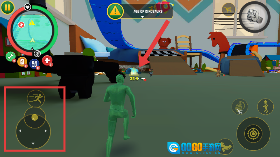 2. 利用左侧的方向按钮操控角色移动,朝着任务目标点行进(例如距离为35M的位置)。