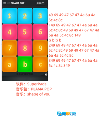 2、乐谱右侧的数字与字母,各自对应乐谱上的数字和字母,若它们紧紧挨着,就意味着需要同时按下。
