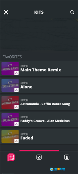 如图,左上角加粗字体即为音乐包的名称。若要寻找所需音乐包,点击KIT即可看到列表。